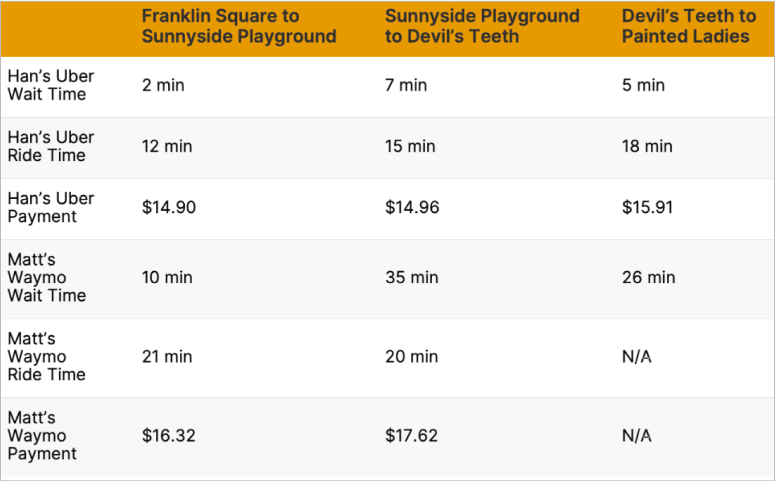 Waymo rides are more expensive and have longer wait and ride times compared to Uber.*