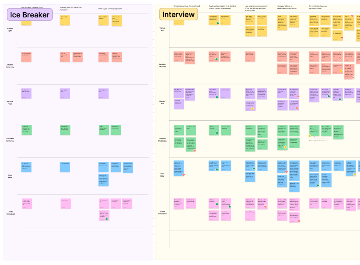 The questions we’ve created dive into - Participant’s choices, Experiences, Perceptions of autonomous vehicles. We focused on the user’s feelings of safety and past experiences to uncover valuable information for the project.